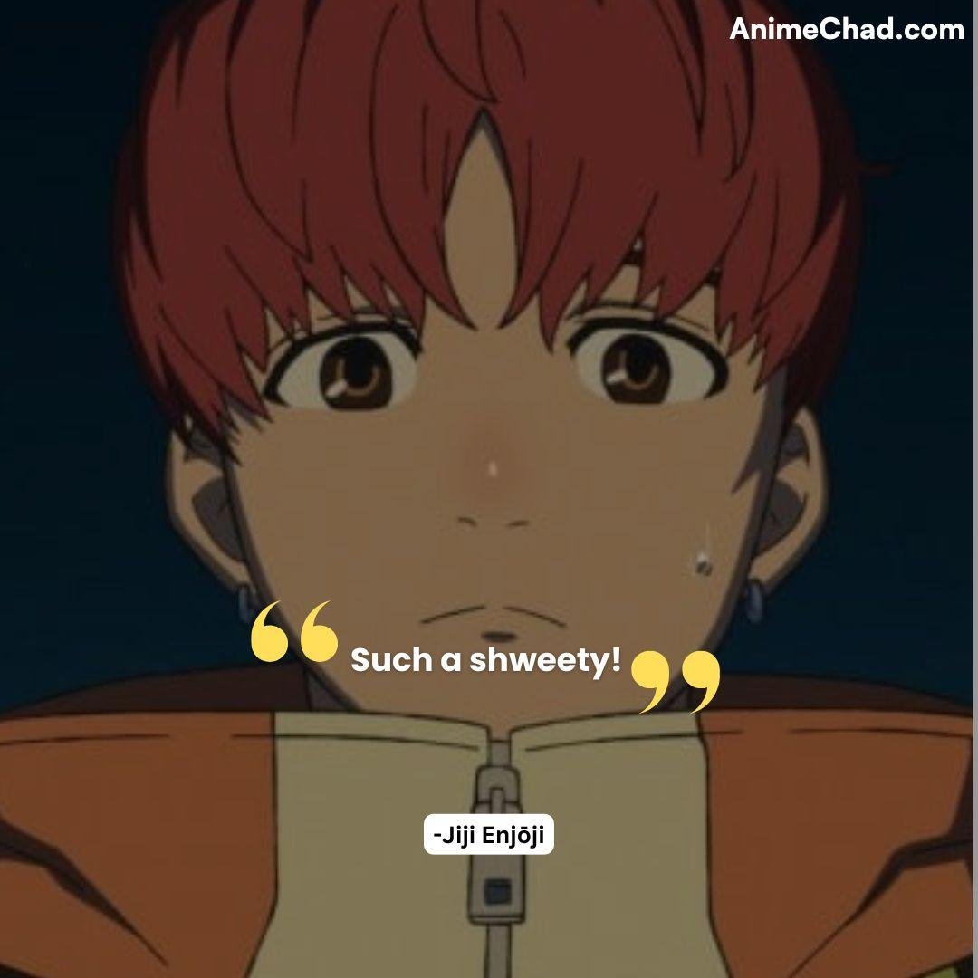 Jiji’s flirtatious catchphrase toward Momo amplifies his over-the-top persona and comedic obsession with her.