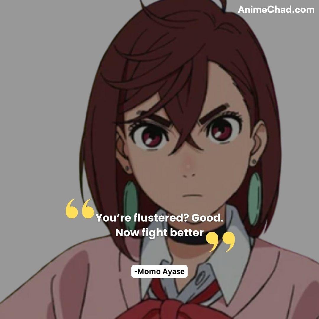 Momo’s abrasive coaching during battle highlights her tough-love approach to Okarun’s growth.