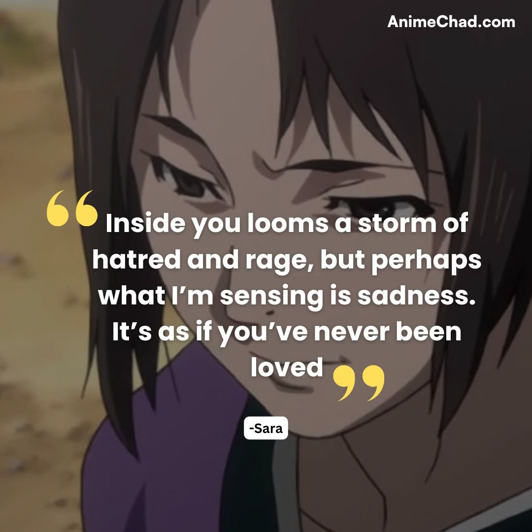 Sara’s insight into Mugen’s isolation reveals his vulnerability beneath the bravado.
