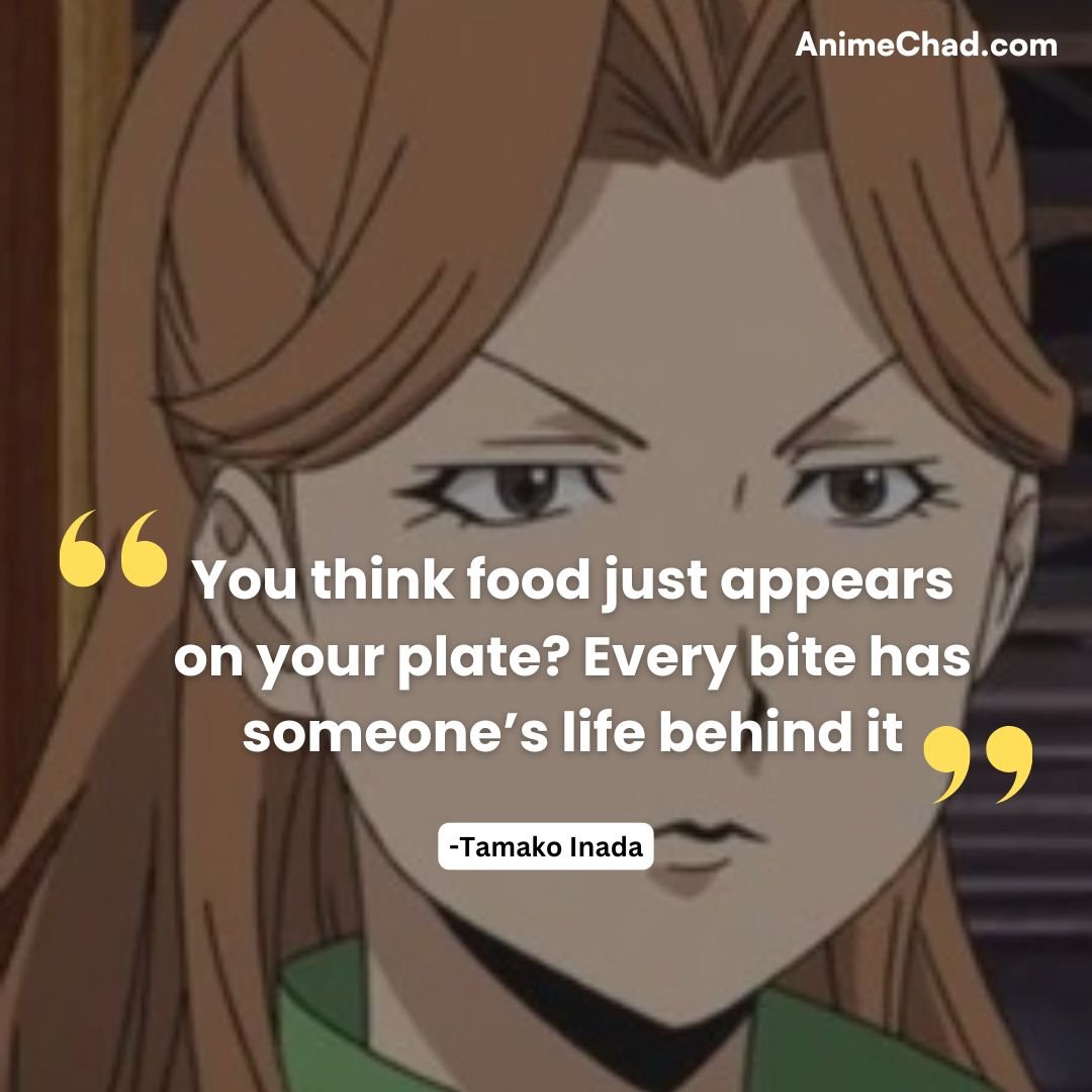 Tamako’s blunt lesson to Hachiken about the ethics of meat production, challenging his urban naivety.