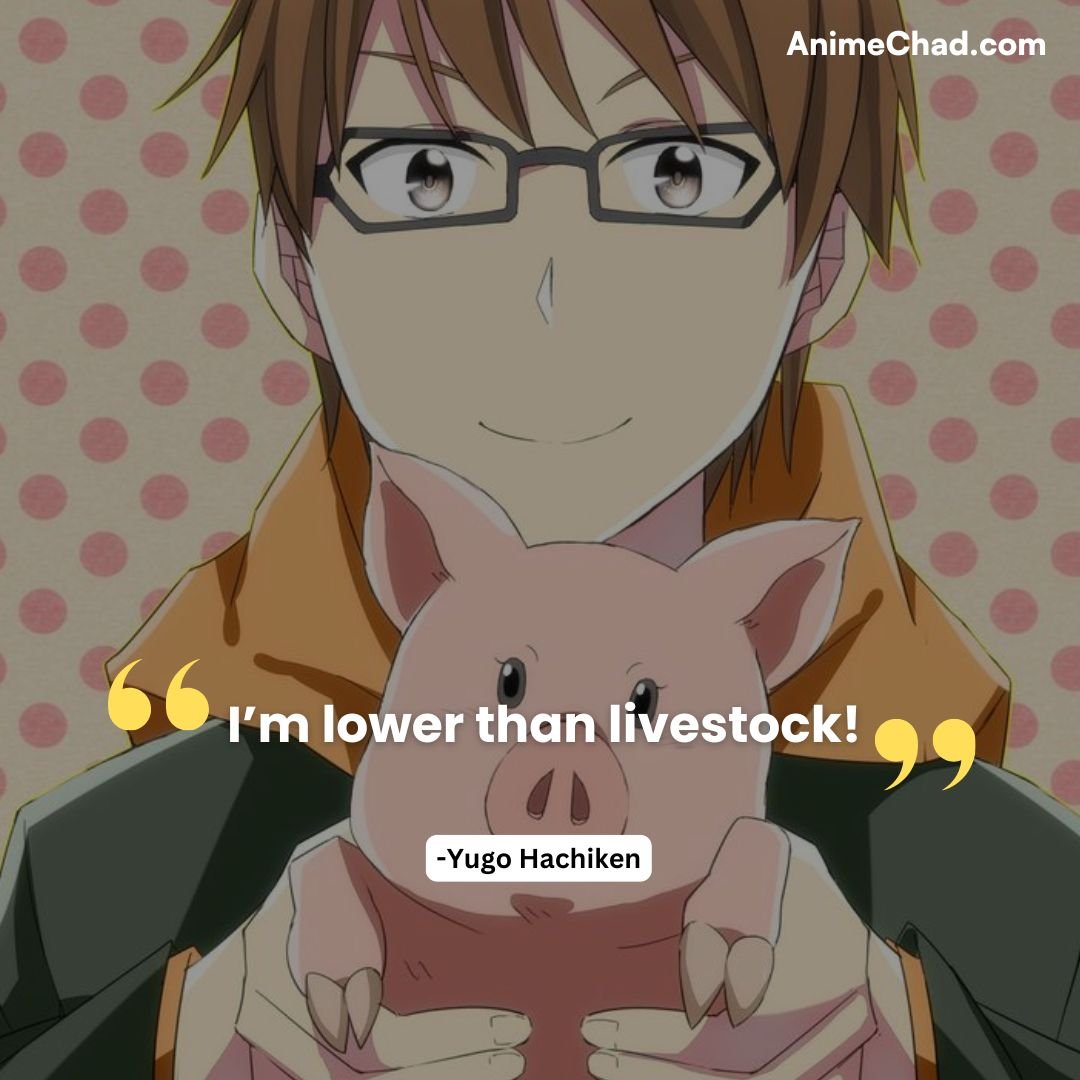 Hachiken’s self-deprecating outburst after failing to save a piglet, highlighting his struggle with inadequacy and farm life’s harsh realities.